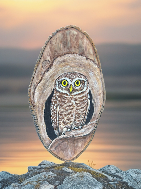 Little Owl is hand-painted in our Oromocto, NB studio on white cedar. The outside edge is carved and painted to look like bark. This painting would be an outstanding addition to any home or office. Please click on the image above to see more. Thanks and Chimo!
